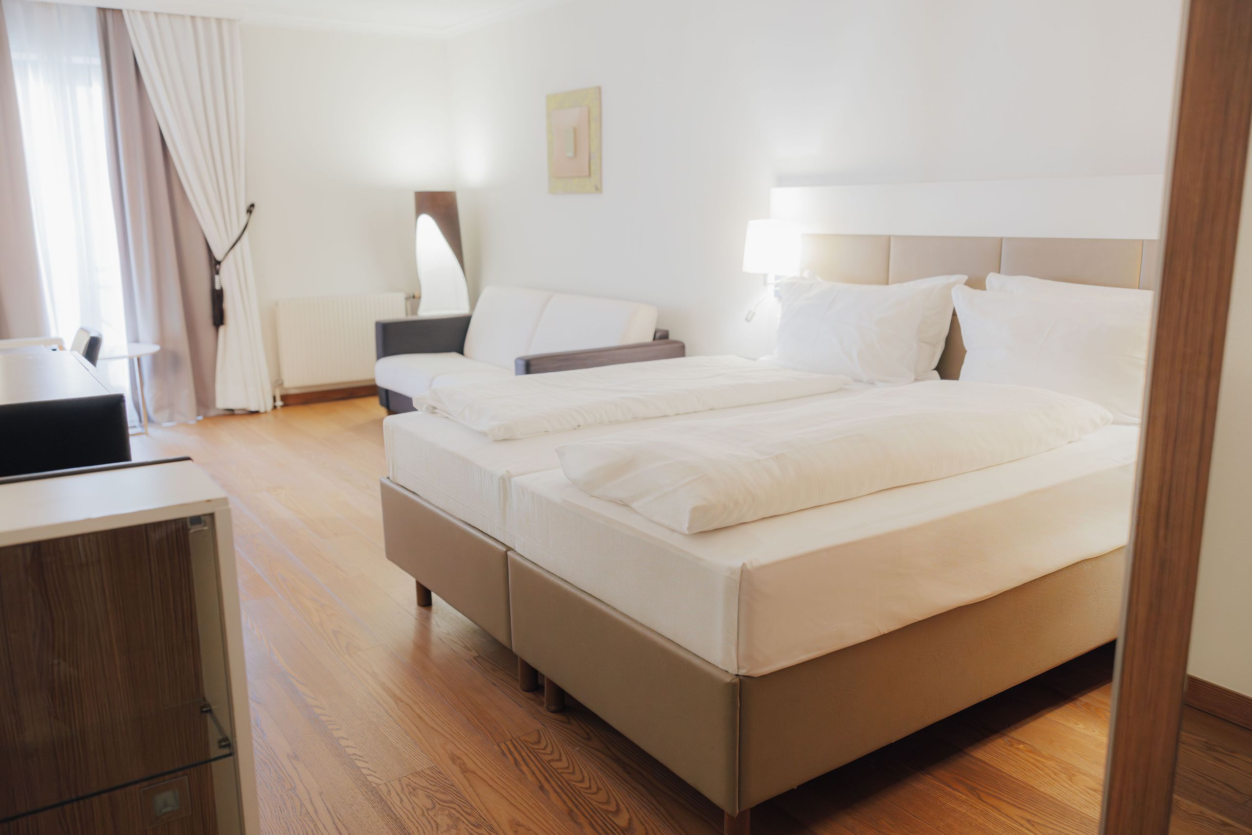 Estas suites junior (45 m²) con vistas parciales a los viñedos le ofrecen un ambiente elegante y acogedor. Las zonas de estar y de dormir están separadas visualmente por un elemento de armario. Con cama doble, sofá cama, amplio cuarto de baño, escritorio, la mayoría con balcón o ventana convertible.